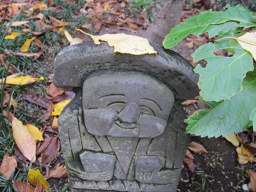 今朝、お地蔵様の頭の上に葉っぱがありました。