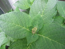 本堂から見える中庭の紫陽花が9年目にしてかわいらしい花芽を3箇所つけました!!!